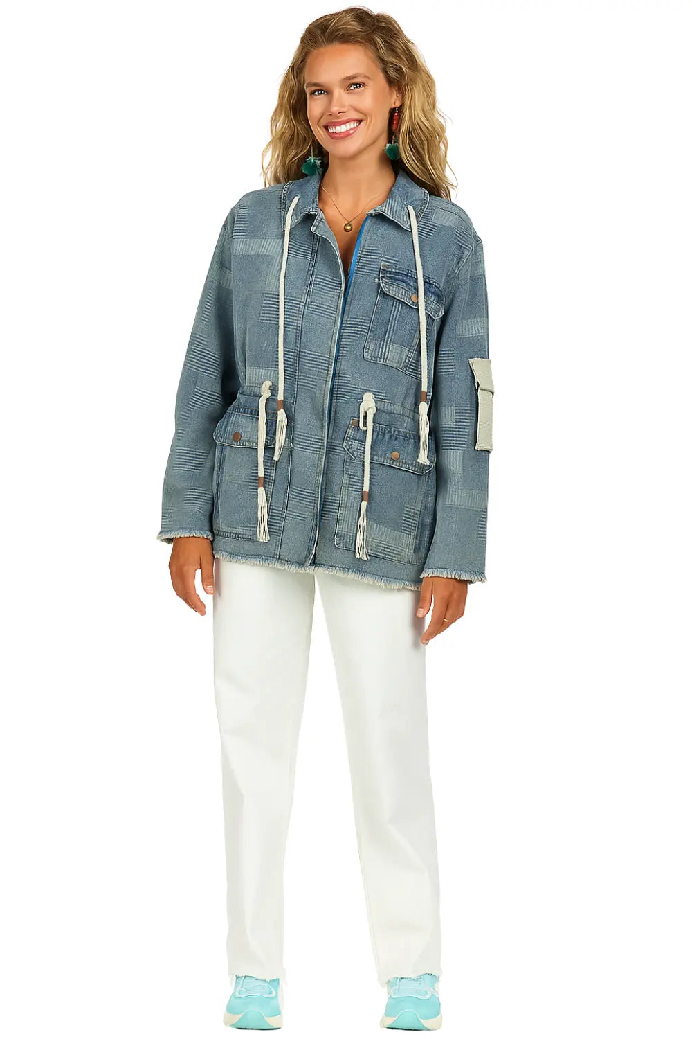 Oversized zip-up denim jacket with drawstring hood, raw hem, and distressed cotton finish, designed for casual urban dressing with a streetwear edge.