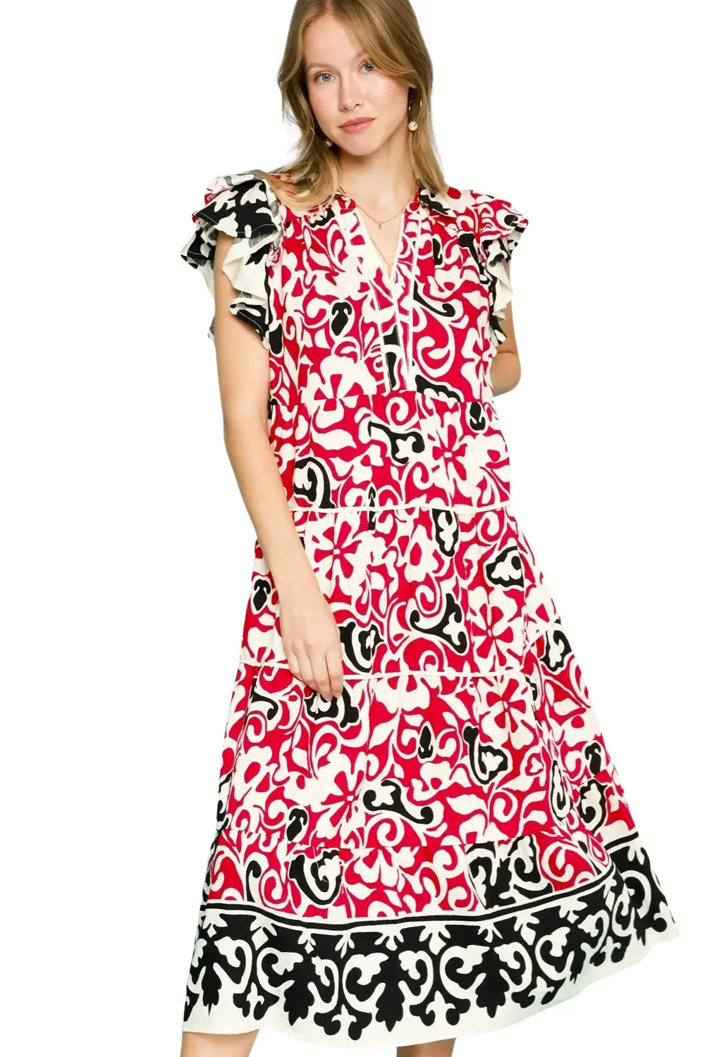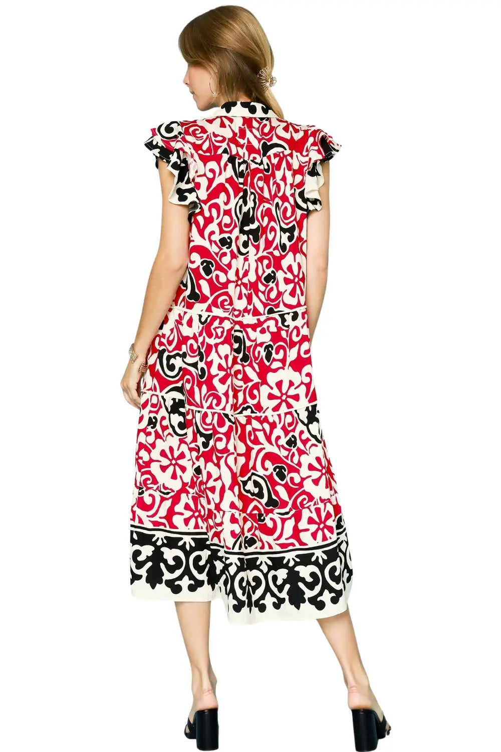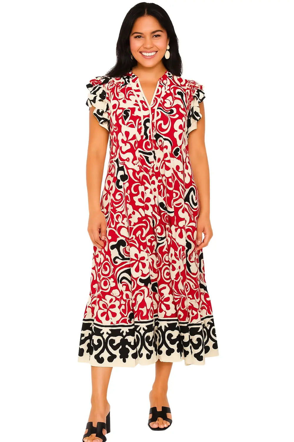Bohemian-inspired midi dress with red floral print, ruffled cap sleeves, and V-neckline, crafted from airy fabric for bold, easygoing summer style.