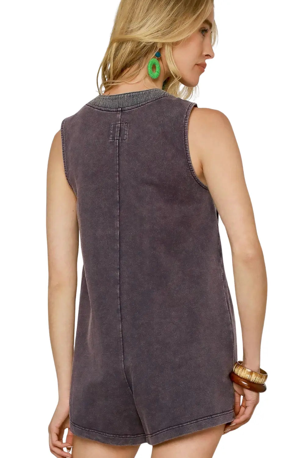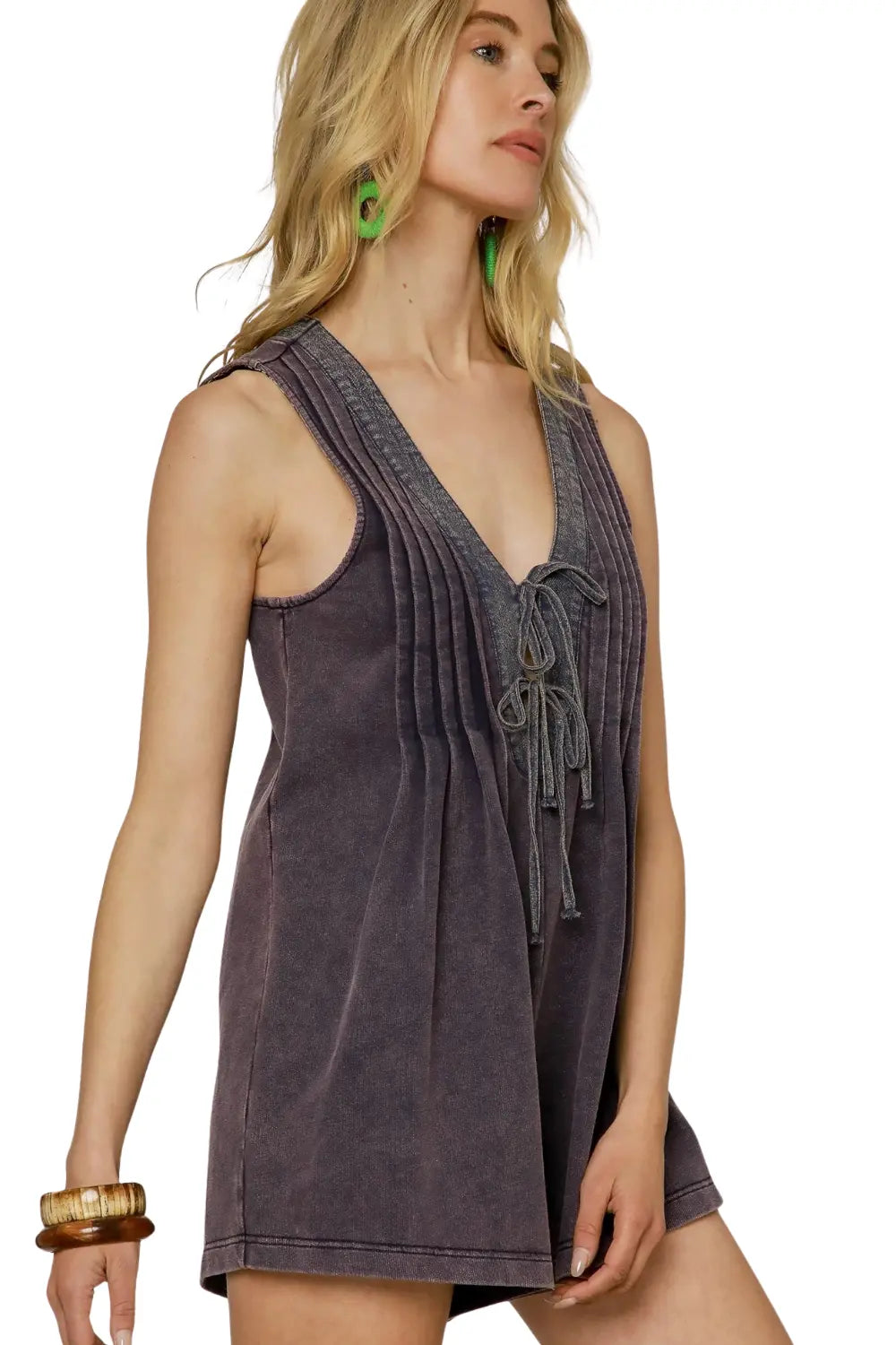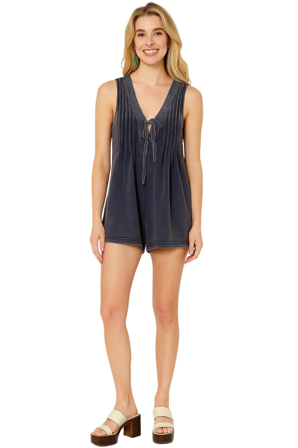 Sleeveless cotton romper with lace-up neckline and relaxed fit, crafted in navy with vintage-washed finish for laid-back summer styling.